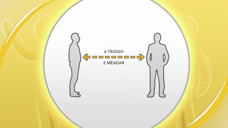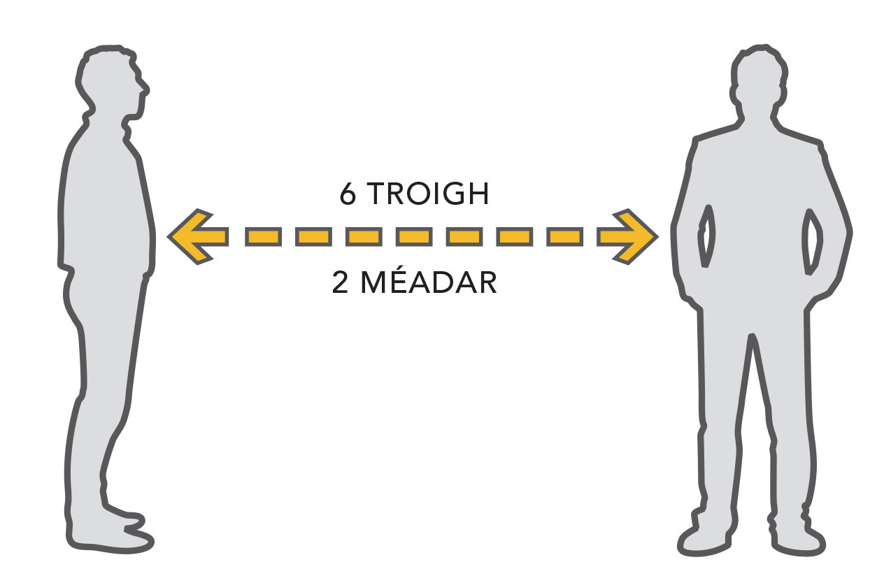 Is féidir le casachtach agus sraothartach frídíní a scaipeadh. Mar chosaint ort féin agus ar dhaoine eile, coinnigh achar éigin idir thú féin agus na daoine in aice leat, le do thoil.
